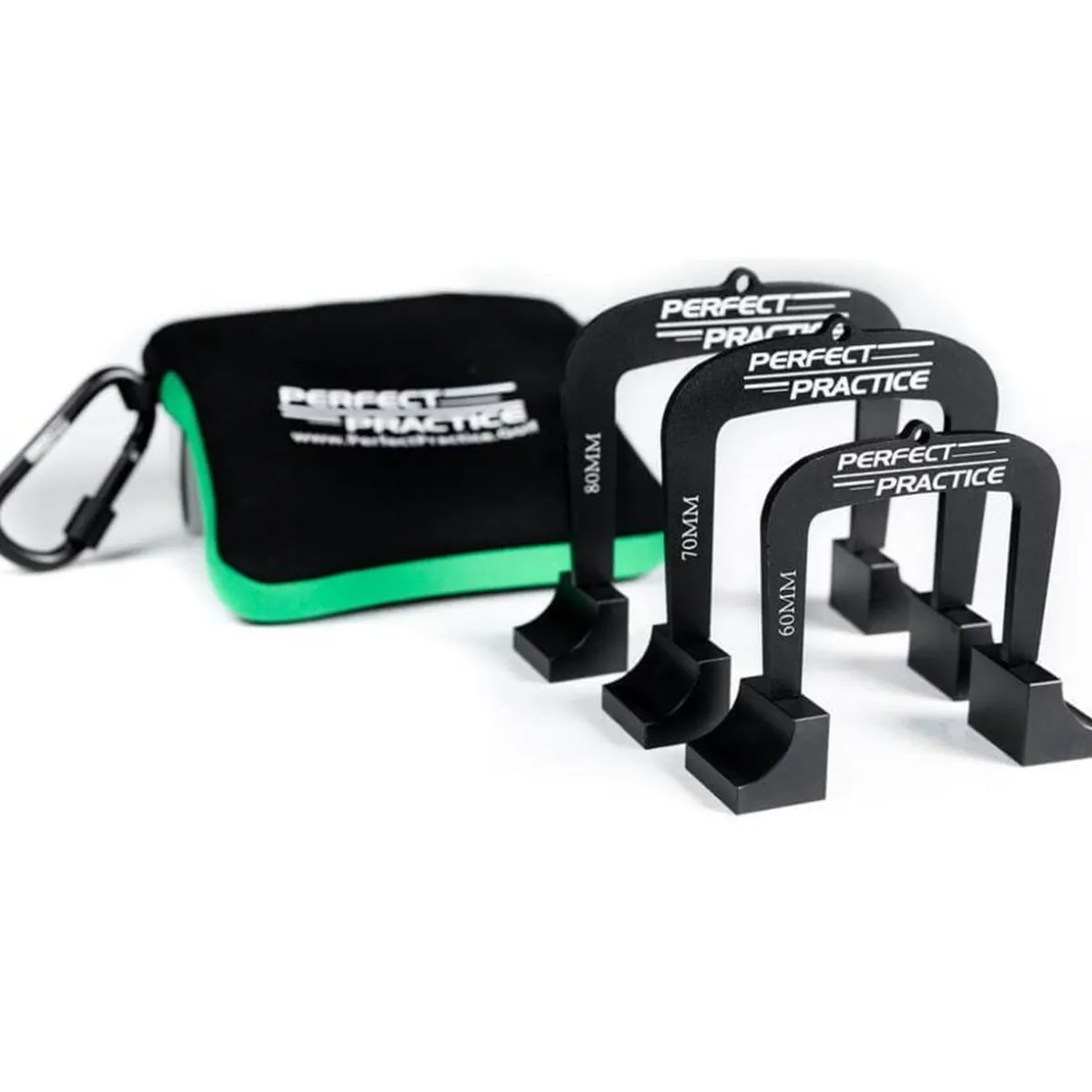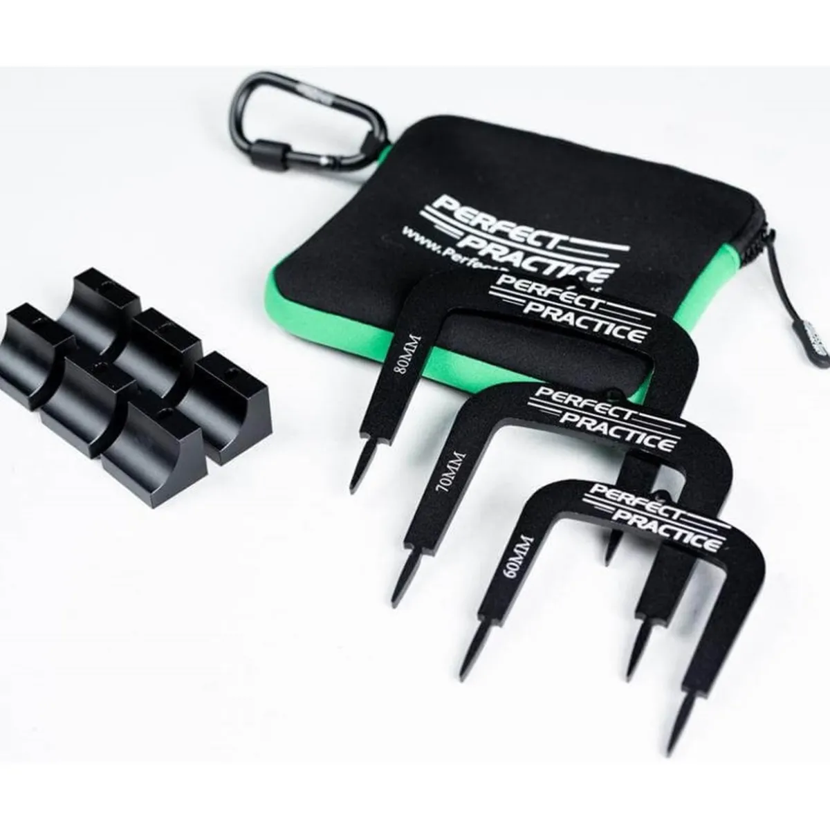 Dial in your putting with our Perfect Putting Gates. With 3 different sizes you can create multiple putting drills to improve your game. Simple detachable legs to keep your gates safe in the case and use on course. Small Gate is 60mm: gap of less than 1 and 1/2 golf balls. Medium Gate is 70mm: gap of 1 and 3/4 golf balls. Large Gate is 80mm: gap of 2 golf balls